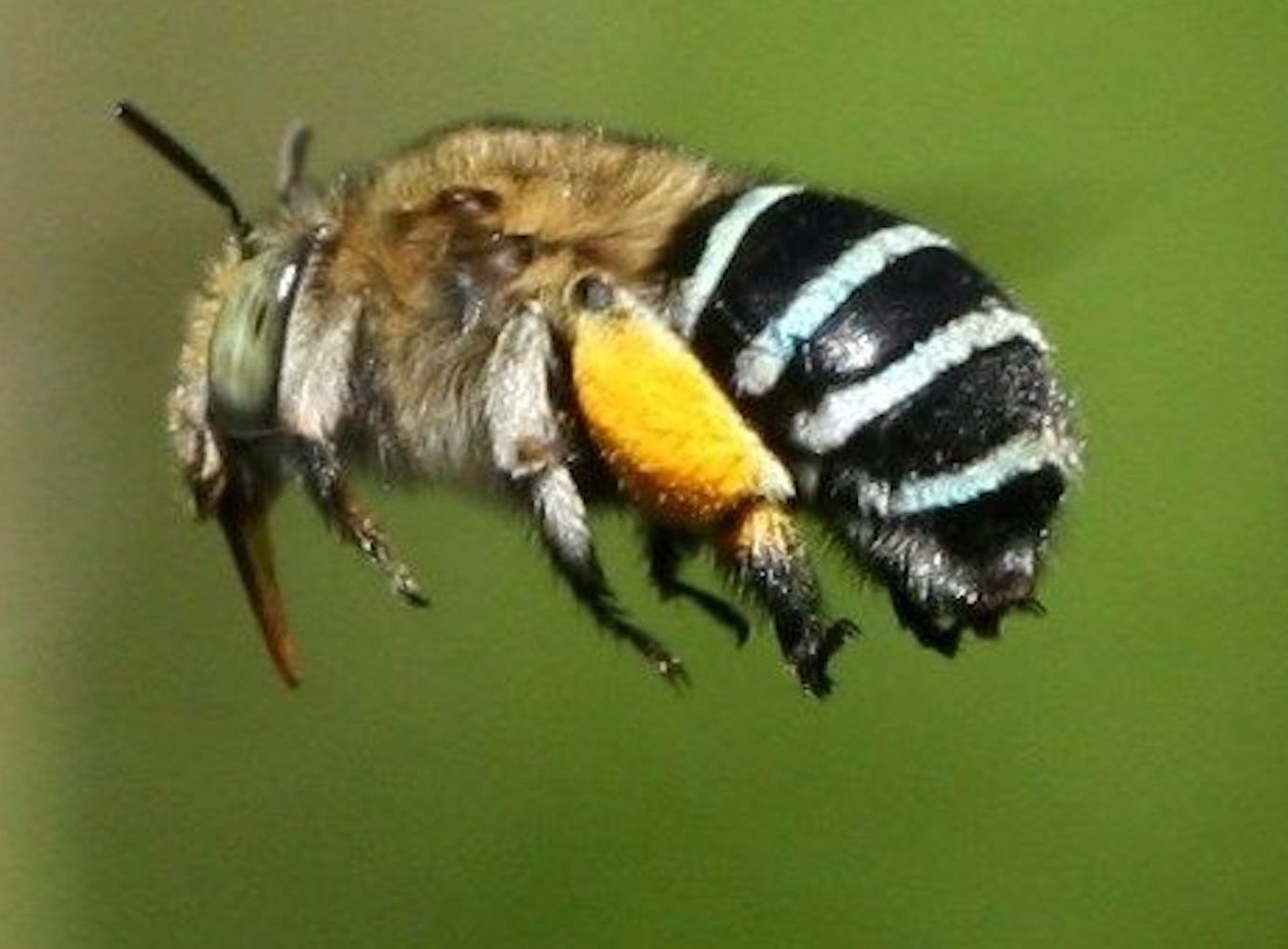 According to this article, it’s true that the only stinging bees in Australia are honeybees (Apis mellifera, or Western honeybee) imported by early settlers to pollinate their fruit trees and provide honey and beeswax. Apart from them, at least 50 species of indigenous bees inhabit the bush-lands surrounding Perth WA, and several are found in suburban parks and gardens like our own: especially the blue-banded bee (Amegilla species). Amegillas can sting, apparently, but usually don’t.