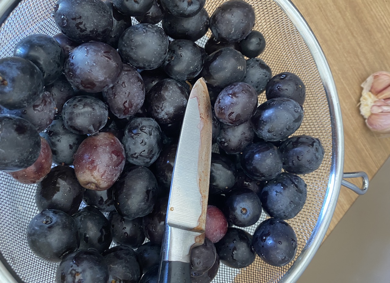To the row of olive trees in Carl and Carrie’s garden here in Perth, WA. Roy had mentioned that just one of them was bearing this year, but I was as usual not listening, or took no heed (being husband-deaf) – until, on a fine March day, sunning myself at the poolside, I looked up to see that one tree simply laden with black fruit. Each one was perfectly formed, and gorgeously ripe. As my father’s daughter, it behoved me to harvest them immediately, and discover how to make them eatable.
